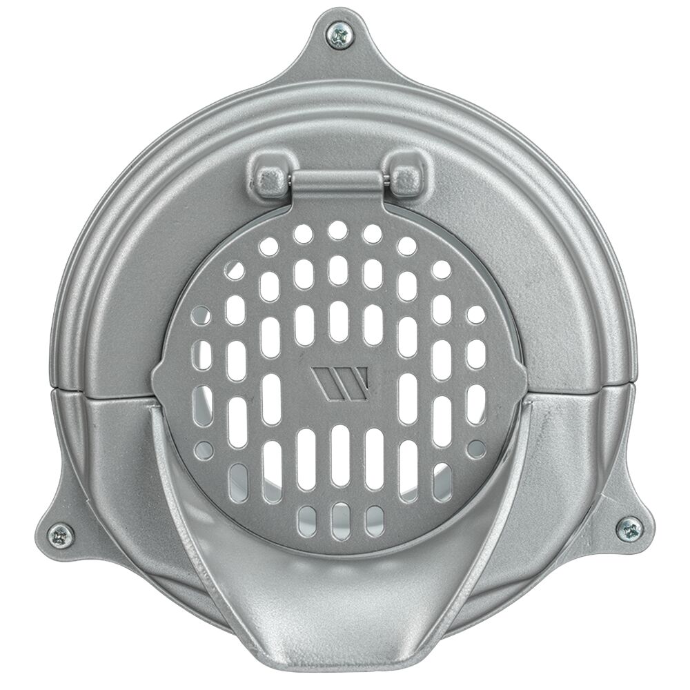 Watts RDA-940 cast aluminum Wallflower™ Downspout Nozzle with integrated wall flange and vandal proof screws for universal gasketed connection for cast iron, PVC, and IPS pipe. Integral hinged bird screen and powder-coated finish. Available in nickel bronze, silver or brick red powder-coated finishes.