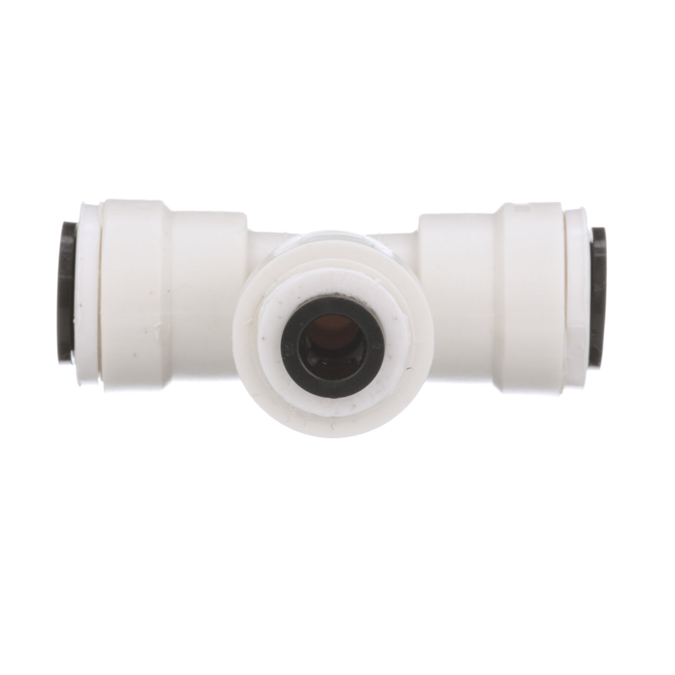 This 1/2 inch x 1/2 inch x 3/8 inch OD AquaLock(TM) mini reducing tee works with plastic or soft copper tubing. It is easy to install, no tools or tube inserts are required. The fitting can be used for hot and cold water applications. The unique O-ring guide feature provides a zero-leak connection. Unlike barb fittings, this fitting joins the tubing on the outside, increasing the flow capacity. After a connection has been made even under maximum pressure, the tubing is able to swivel, making the fitting ideal for vibrating and dynamic applications. Available in bulk quantities as contractor pack.