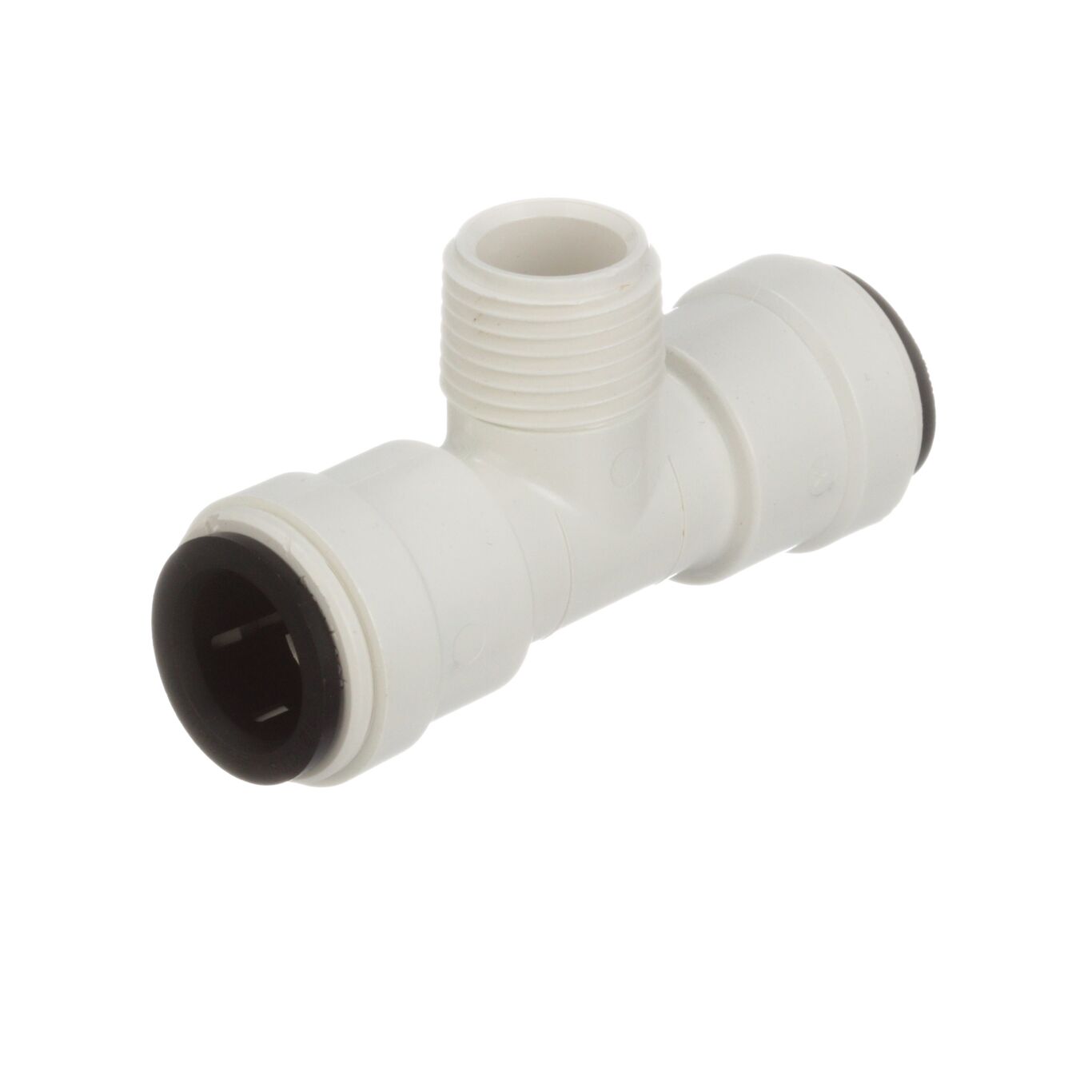 This 1/2 inch CTS x 1/2 inch NPT AquaLock(TM) plastic male threaded tee works with copper, CPVC, PEX, and CTS rated pipe. It is easy to install, no tools or tube inserts are required. The fitting can be used for hot and cold water applications. The unique O-ring guide feature provides a zero-leak connection. Unlike barb fittings, this fitting joins the tubing on the outside, increasing the flow capacity. After a connection has been made even under maximum pressure, the tubing is able to swivel, making the fitting ideal for vibrating and dynamic applications. Available in bulk quantities as contractor pack.